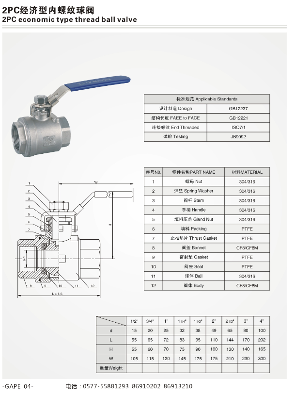 產(chǎn)品名稱:二片式不銹鋼內(nèi)螺紋球閥
